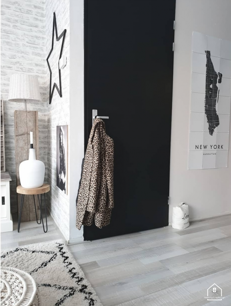Natuurlijk hebben we geen Jan de Bouvrie huis, dat zou ik te steriel vinden. Ik durf gelukkig ook veel, ook met kleur op de muur of behang of onze eettafel stoelen. Zo heb ik onze schuifpui, de kozijnen, binnendeuren en trap mat zwart geverfd.
