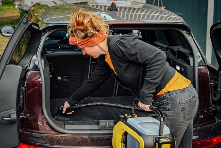 Met dit apparaat kun je in korte tijd veel doen en zorgen dat alles weer op en top schoon is. Het voordeel is dat het een accu geladen apparaat is, licht van gewicht en erg handzaam. Dit accu-apparaat is onderdeel van het Kärcher accuplatform en de accu past dus op tal van andere apparaten De slang is erg flexibel en de zuigmond kan ook makkelijk in alle hoeken en moeilijke ruimtes komen. Ik nam hem mee de tuin in om de kussens van mijn tuinstoelen schoon te maken en maakte mijn auto goed schoon, let’s try!