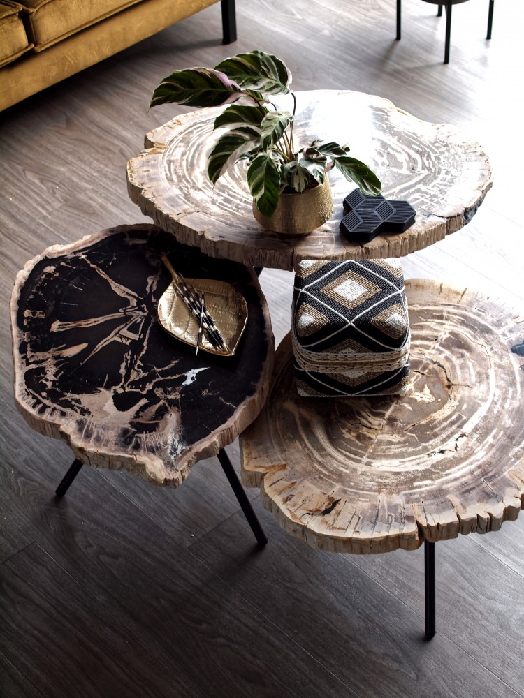 De salontafels zijn van Goossens en heten Menda. Hou er wel rekening mee dat het een natuurproduct is (versteend hout) en geen enkele tafel hetzelfde is. Het is dus nooit zeker welke kleurstelling/tekening je ontvangt met bestellen. Maar hoe dan ook is het altijd prachtig!