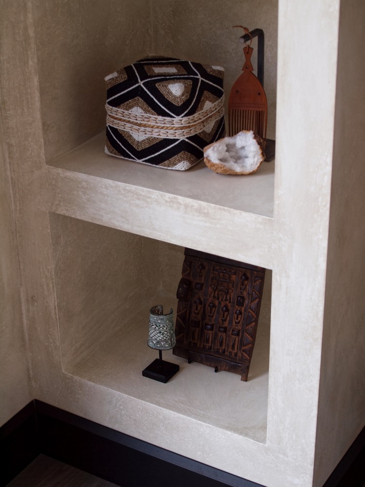 Maar hoe passen we dit dan het mooiste toe? We wisten 1 ding zeker: alles moet als een geheel voelen en rust ademen. Door mijn voorliefde voor handgemaakte etnische producten (welke we onder andere meenemen van onze reizen) hadden wij vooral belang bij ruimte om al deze eyecatchers tentoon te stellen en zo kwamen we al snel op het idee om een soort ingebouwde niskast te maken als verlengstuk van het zwevende tvmeubel. Zo konden wij hier dimbare verlichting in verwerken, mooie spullen neerzetten en herhaalden we niet weer precies hetzelfde trucje met een houten kast. Door deze nis op te laten gaan in de muurkleur bracht het weer eenheid en was het net of het er altijd al heeft gezeten.