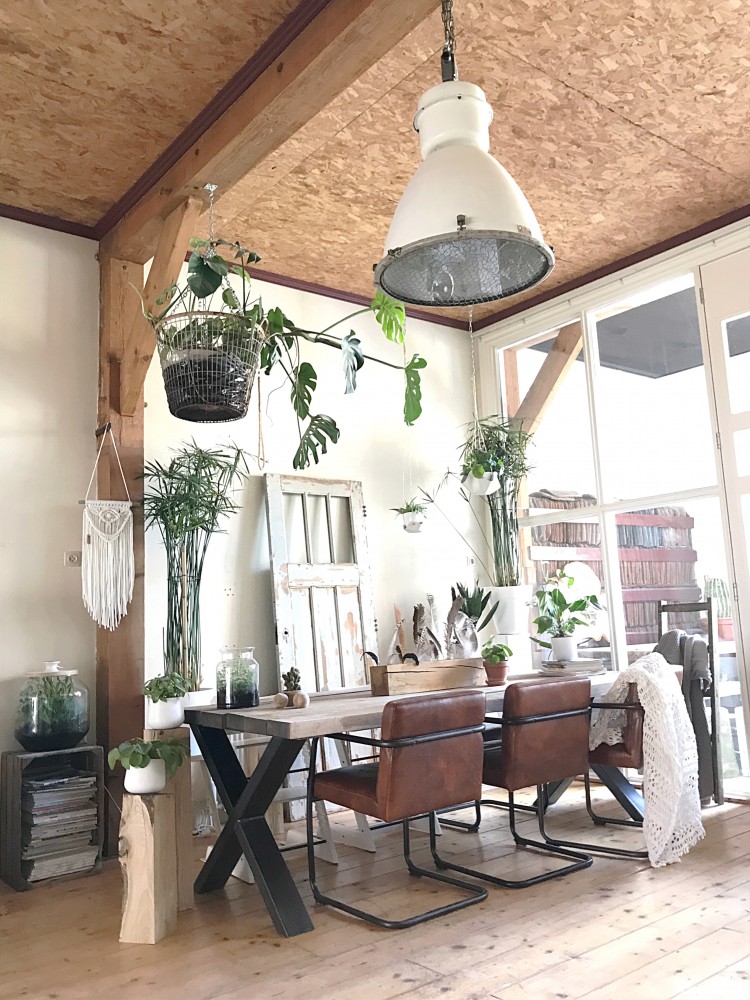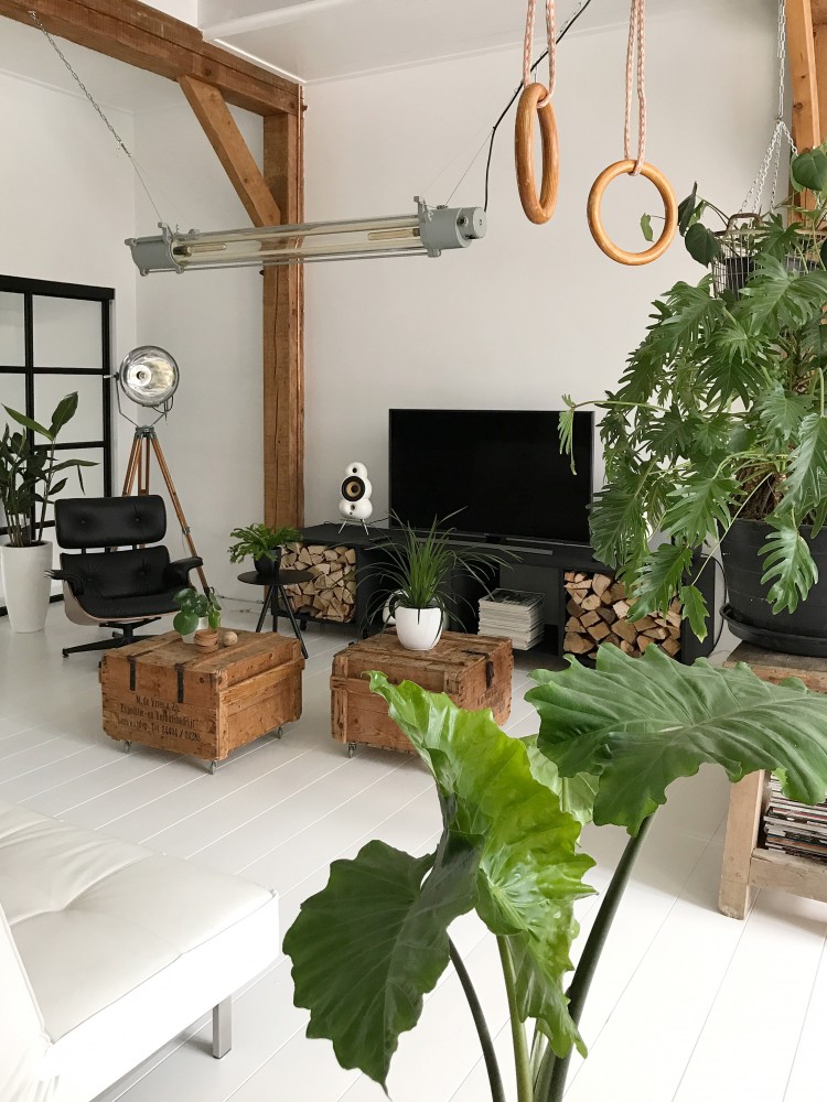 We hebben geprobeerd om de houten binten goed naar voren te laten komen. En die ringen in de kamer dat is altijd een droom van mij geweest doordat ik vroeger heb geturnd. En die fiets aan de muur, die is nu heel tof maar doordat Jan en ik erg van afwisseling houden kan het zo zijn dat deze blog online gaat er al weer wat anders hangt.